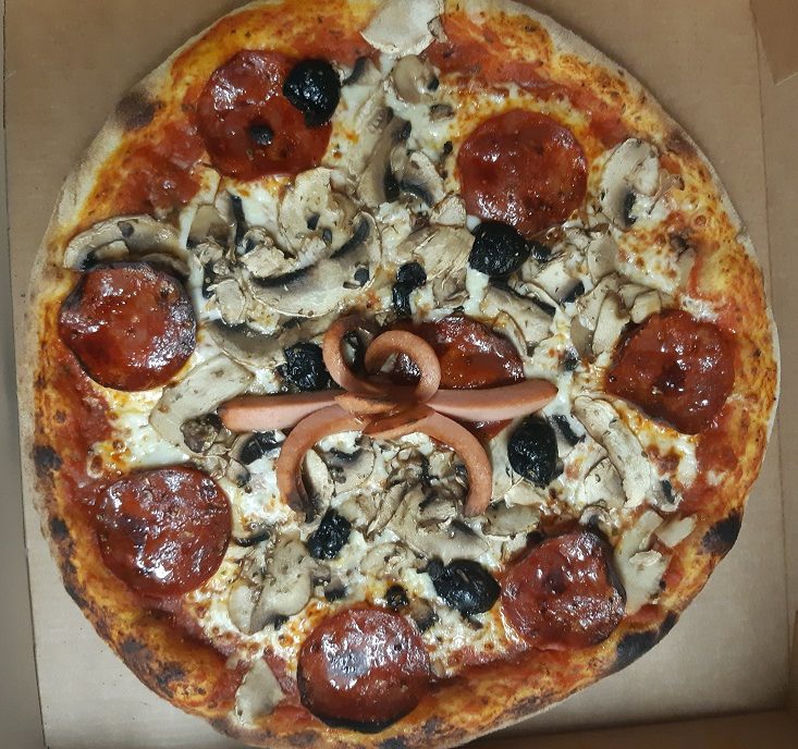 Tomate, mozzarella, champignons, saucisses, chorizo, olives