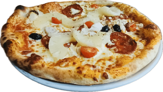 Tomate, mozzarella, émincé de poulet, chorizo, ananas, olives