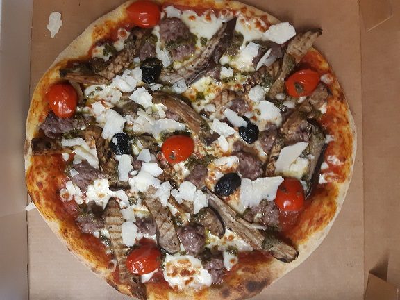 Tomate, mozzarella, aubergines, hachis de bœuf, origan tomates cerises, copeaux de parmesan