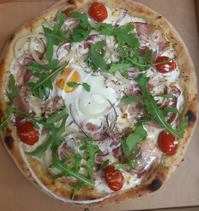 Base crème, mozzarella, oignons, pancetta, tomates cerises, œuf, roquette