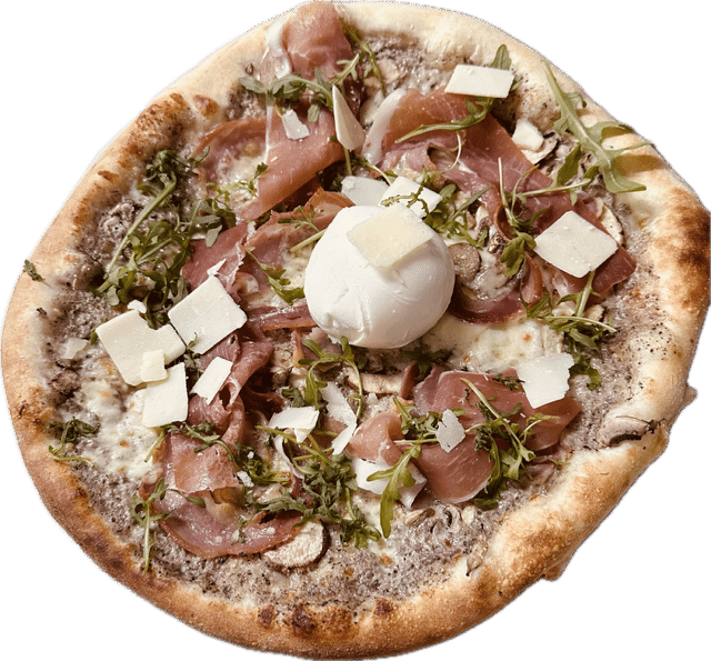 Crème a la Truffe, parmigiano, champignons, pancetta, jambon de parme, mozzarella di bufala, roquette