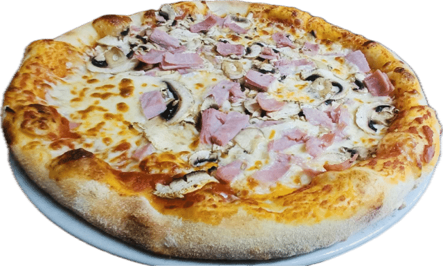Sauce tomate, mozzarella, champignons, jambon, origan