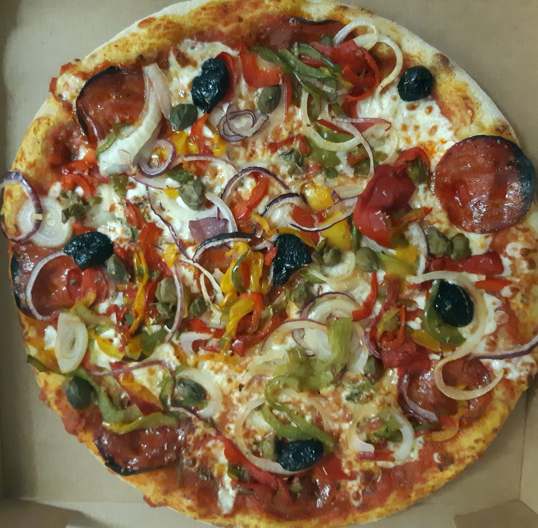 Tomate, mozzarella, chorizo, câpres, oignons, poivrons, anchois, olives, origan