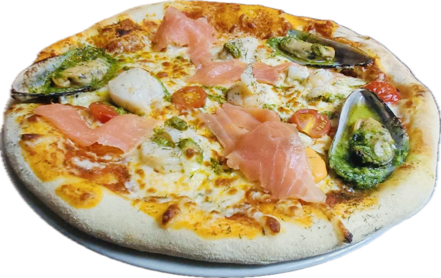 Tomate, mozzarella, crème, scampis, saint jacques, Saumon fumé, moules nouvelle-Zélande