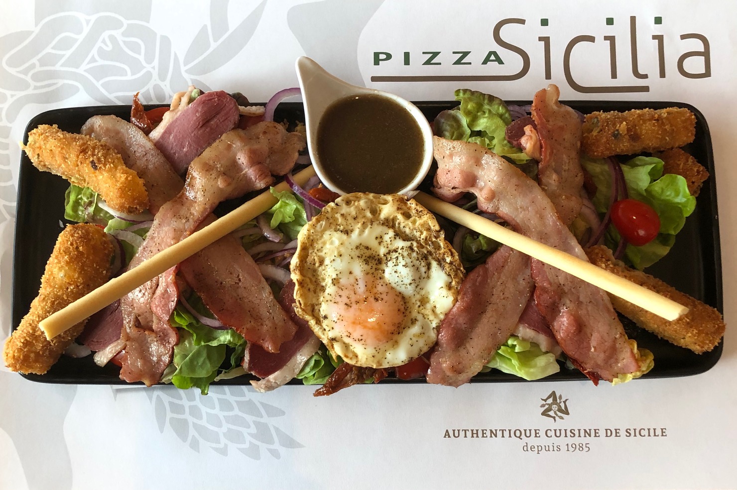 Salades, tomates, pancetta grillée, lardons, oeuf, Chèvres panés, oignons, olives