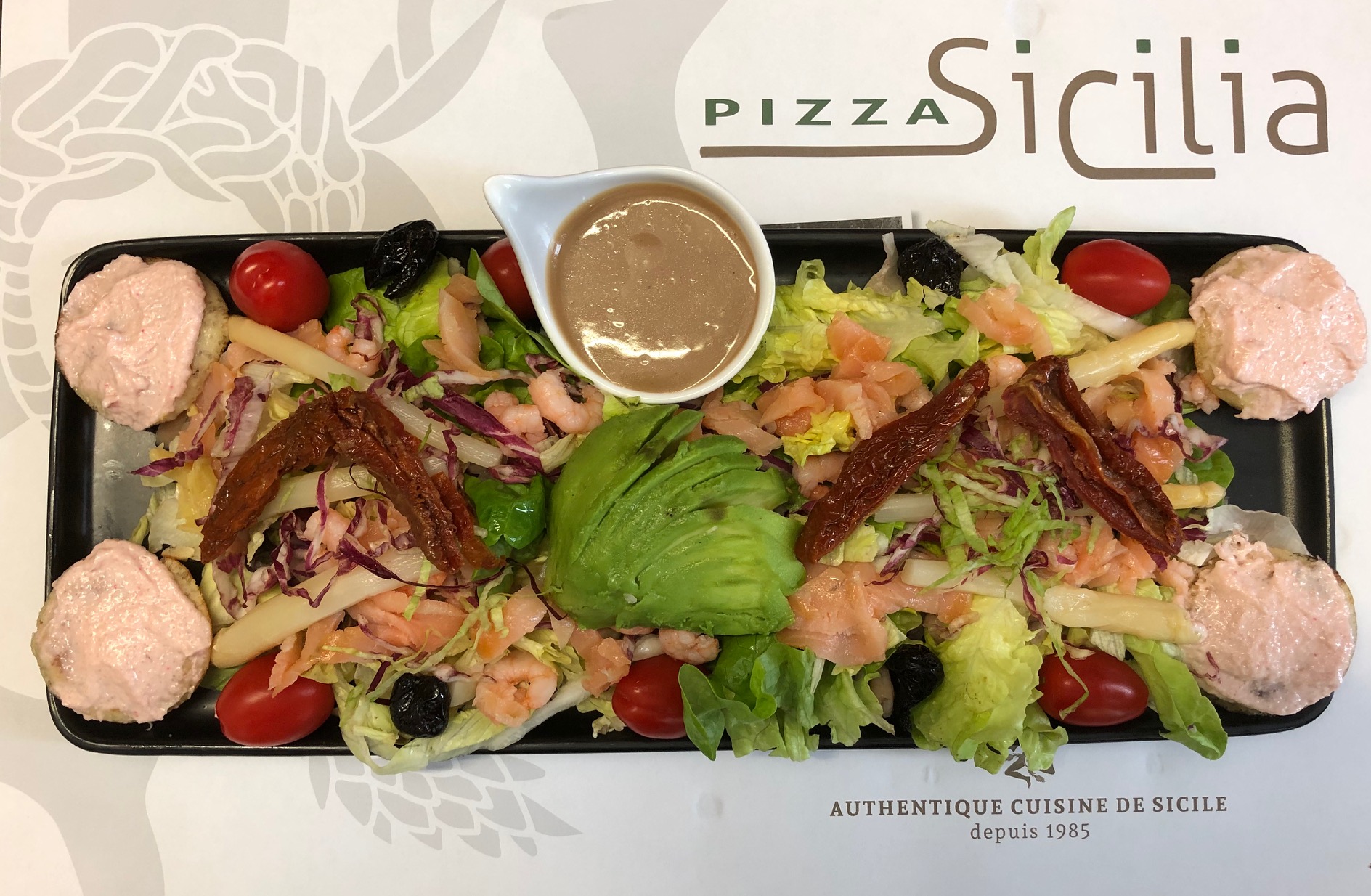 Salades, tomates, avocat, crevettes, tomates confites, oignons, saumon fumé en julienne, Tarama sur blini, olives