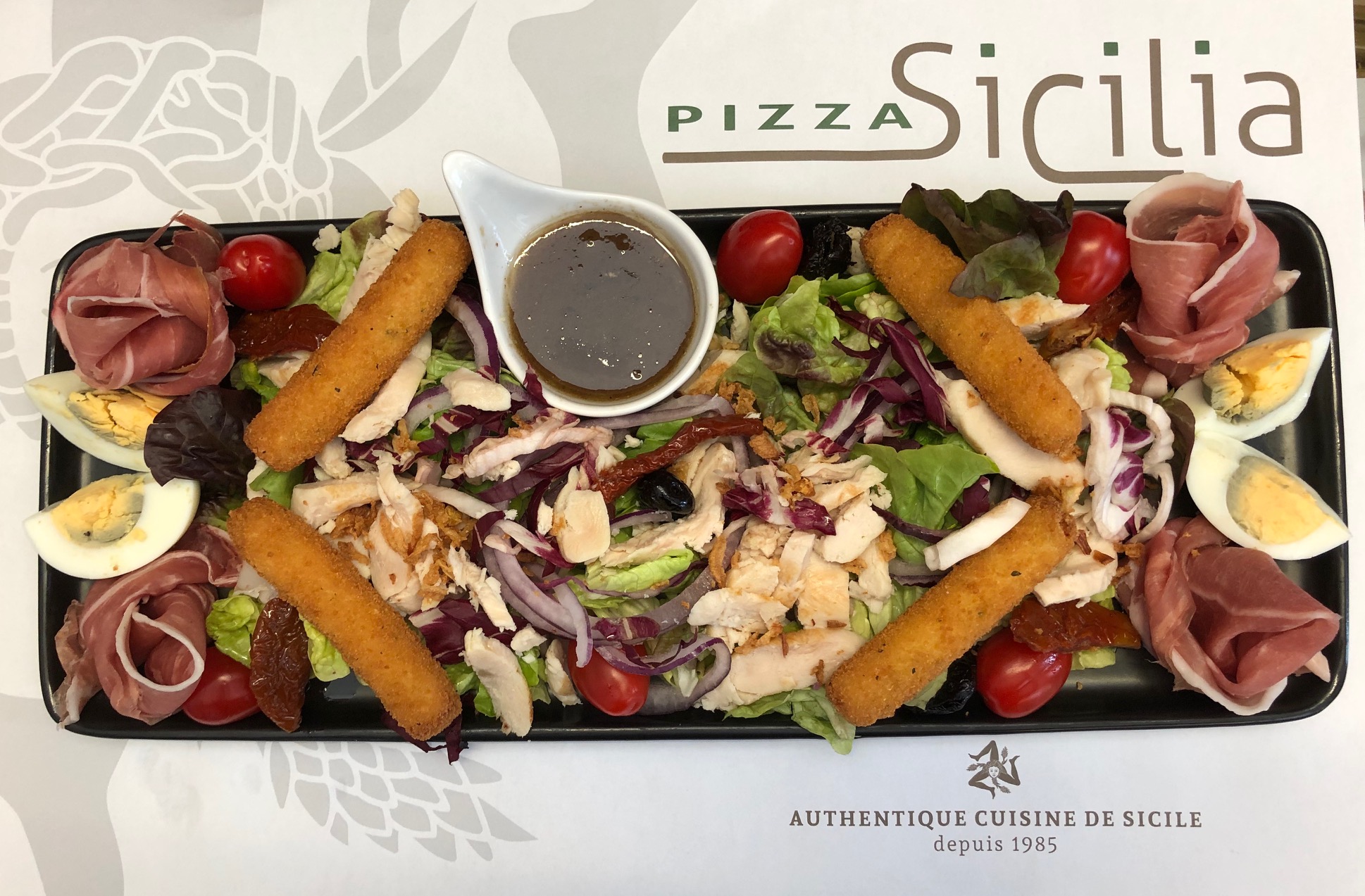 Salades, tomates, Jambon de parme, tomates confites, mozzarella panée, œuf dur, émincé de poulet, oignons, olives.